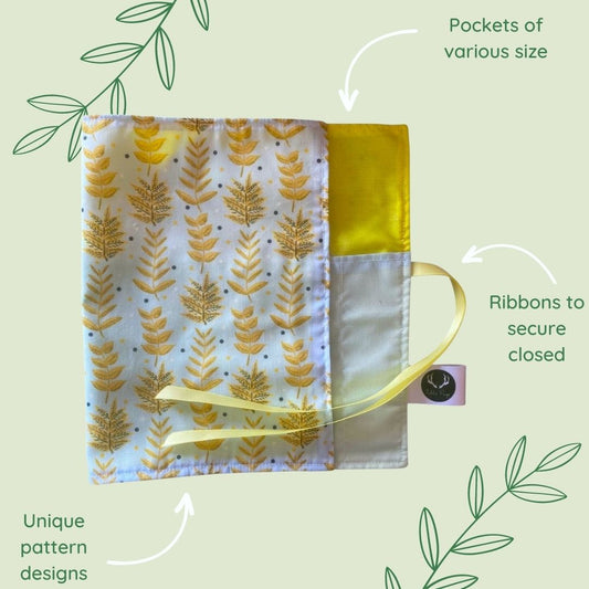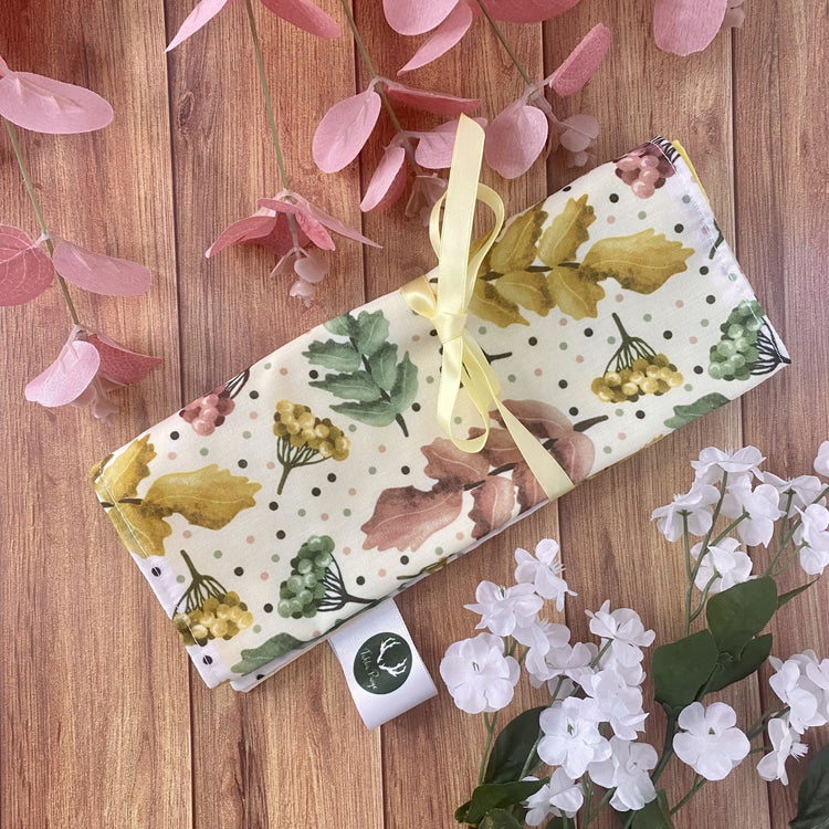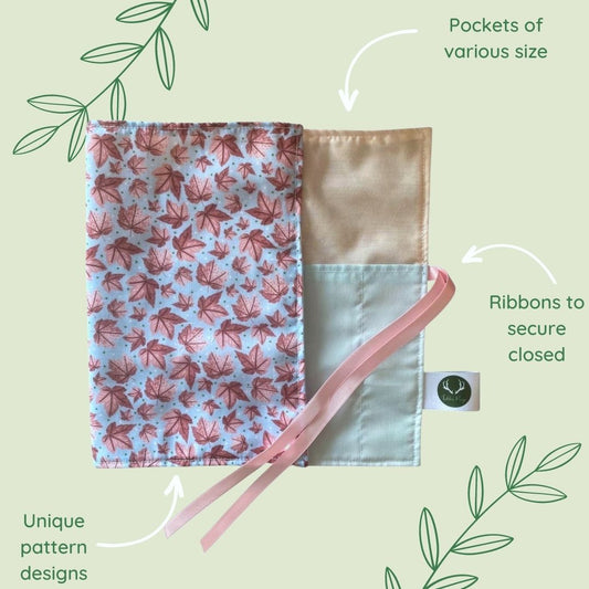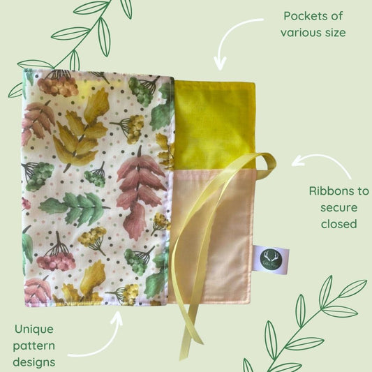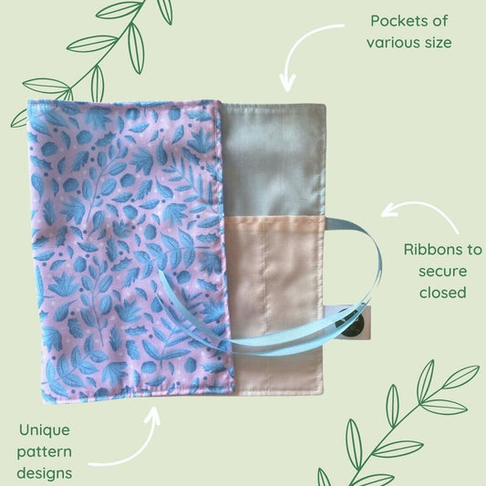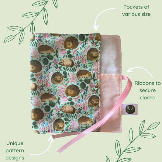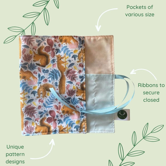Our pretty brush wraps or rolls are perfect for storing and carrying makeup brushes, pencils, pens, or a range of artist's materials. The wrap features a number of pockets varying in size, as well as a gorgeous patterned outer layer and ribbons to secure the wrap closed once rolled.